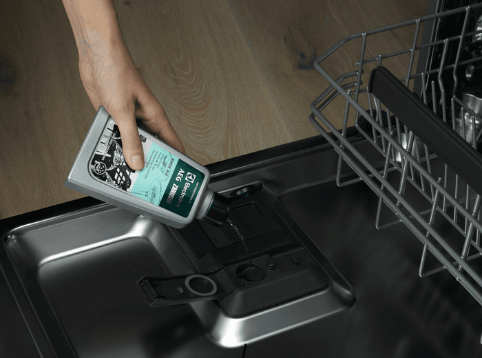 - Wischen Sie eventuell verschütteten Klarspüler sofort zum Beispiel mit einem Küchentuch weg.