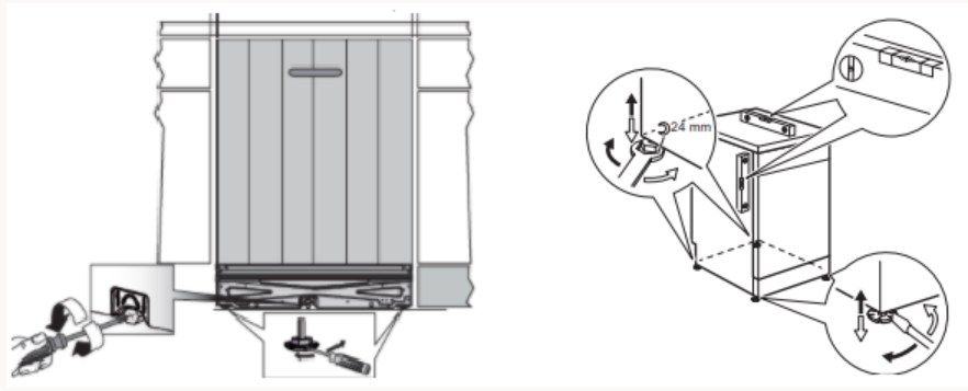 - Prüfen Sie, ob sich der Geschirrspüler in der Waage befindet und verstellen Sie gegebenenfalls die Verstellfüße.