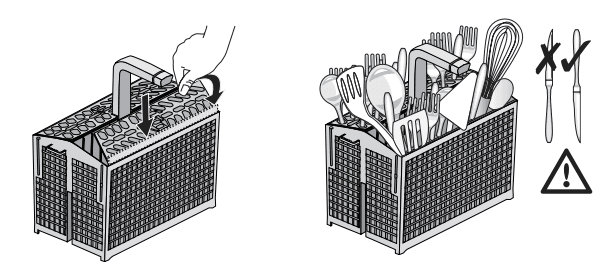 - Achten Sie darauf, dass sich genug Zwischenraum zwischen den Besteckteilen befindet und der Korb nicht überfüllt ist.