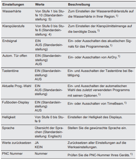 (im Ecometer verfügbare Einstellungen sind: Wasserenthärter, Härtegrad, Klarspülmittelmenge, Endsignal, AirDry,
