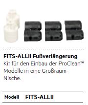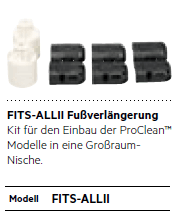 Fußverlängerungen für die Großraumnische der ProClean-Modelle bis 94 cm sind als Sonderzubehör mit der Bezeichnung FITS-ALLII beim Fachhändler erhältlich.