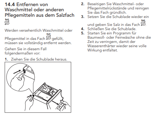 Nach dem Reinigen der Schublade muss ein Baumwoll- oder Feinwasch-Programm ohne Zeitverkürzung gestartet werden, damit der Wasserenthärter wieder seine volle Wirkung entfaltet.