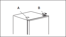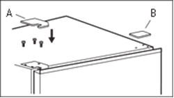 19. Nehmen Sie eine obere Scharnierabdeckung (A) aus einer Tasche. Installieren Sie es am oberen Scharnier. Setzen Sie die Schraubenlochabdeckung (B) oben rechts auf das Gerät, wo sich die Schraubenlöcher befinden