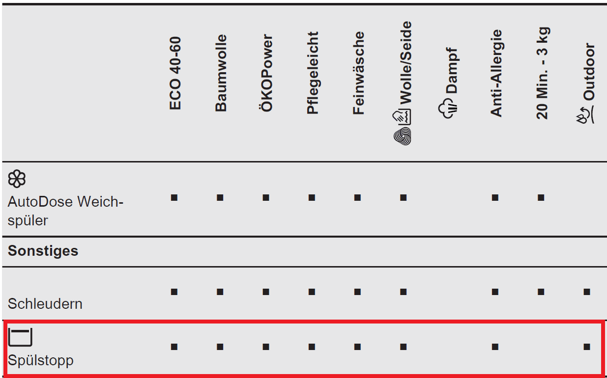 - In der Bedienungsanleitung finden Sie Hinweise, bei welchen Programmen Spülstopp gewählt werden kann