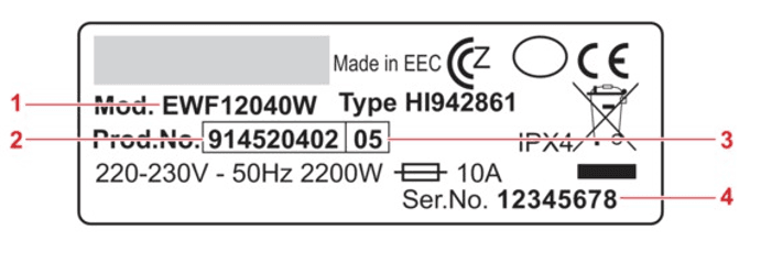 Typenschild mit Modellnummer, Produktnummer (PNC), ELC und Seriennummer: